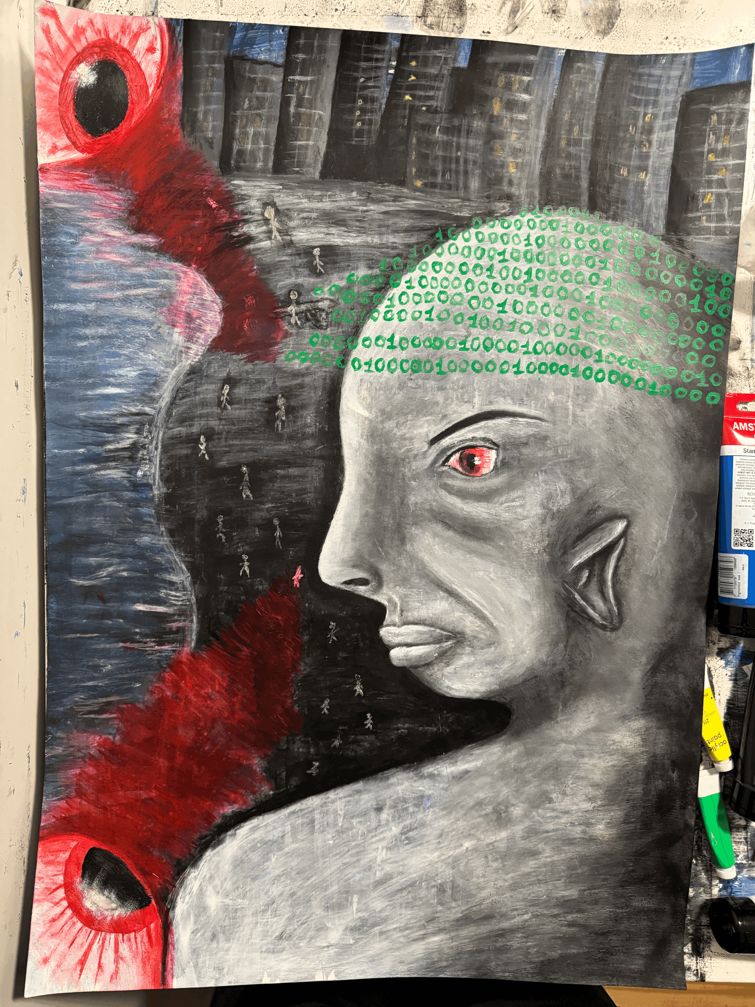 My art focuses on the complex relationship between technology, artificial intelligence, and their impact on human life. Through acrylic paintings and installation art, I examine themes of identity, societal change, and the dilemmas that come with rapid technological progress. My goal is to spark conversation and reflection on how we navigate an increasingly digital world.